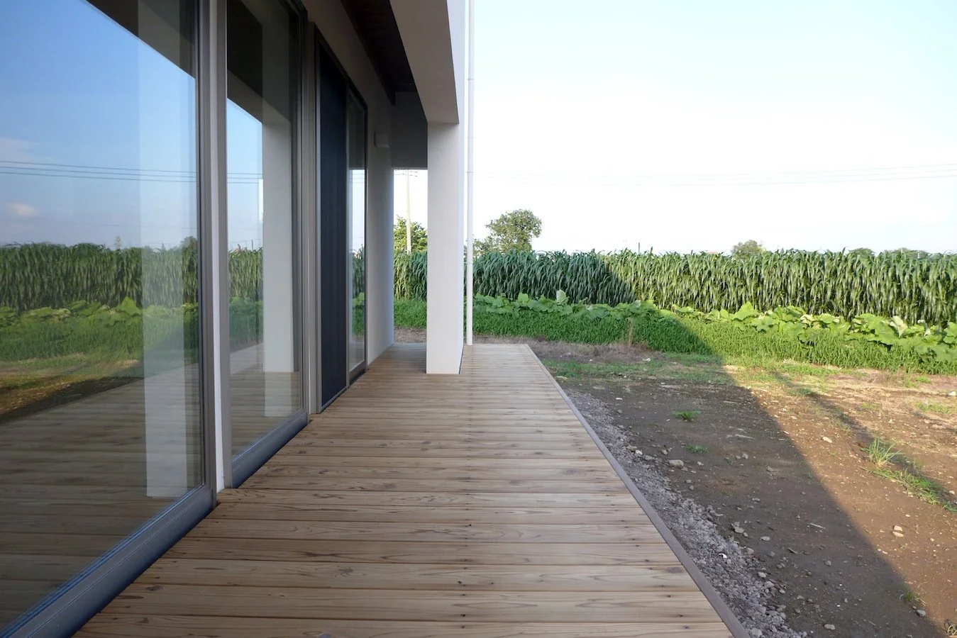 House K is a residence for a family of four. It is located on the outskirts of Maebashi City in Gunma, Japan. The site is surrounded by open agricultural fields with great views of; distant mountains. The house is elongated on an east-west axis, allowing maximum south exposure as well as maximum open space for a home garden on the south side of the lot.